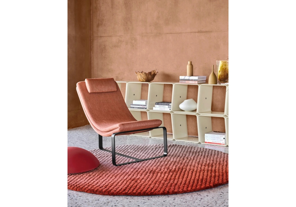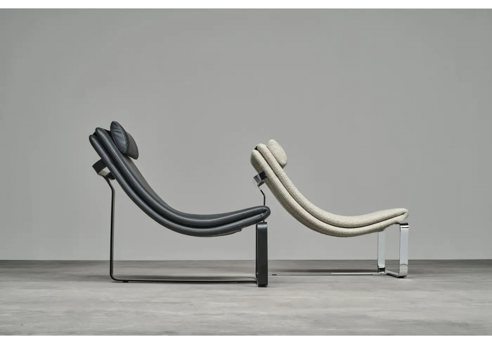 Flipt von Jeff Miller für Baleri Italia entworfen, ist ein wandelbarer Sessel/Chaise Longue mit einer Struktur aus mattschwarz lackiertem oder verchromtem Stahl, Sitz aus flexiblem Kaltformschaum-Polyurethan und verchromtem Stahlgestell. Ein Mechanismus ermöglicht es, die Sitzfläche nach vorn zu kippen, wodurch sie sich öffnet und ihre Länge verdoppelt. Abnehmbarer Bezug aus Stoff oder Leder.