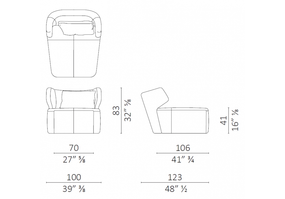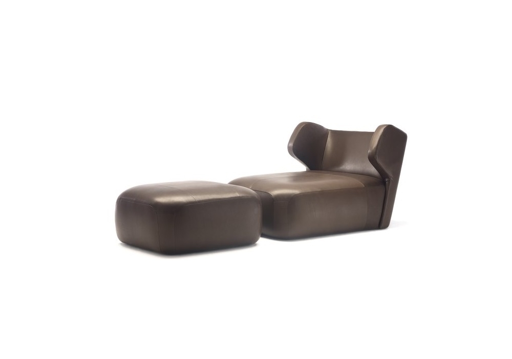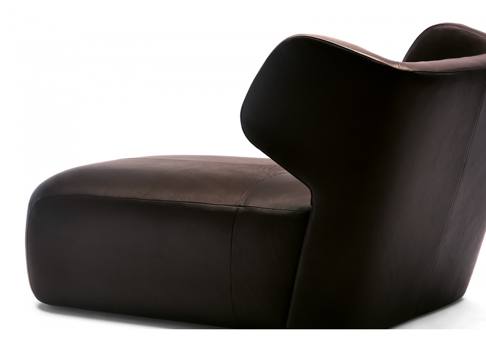 DC 100 by Ceccotti Collezioni is a chaise longue with base in solid wood and back-rest in curved plywood, covered with non-deformable polyurethane foam of various densities, protective cover in polyester fiber, seat with straps, non-removable fabric, leather or natural aniline finished leather covering, including a feather pillow (cm 65x65).