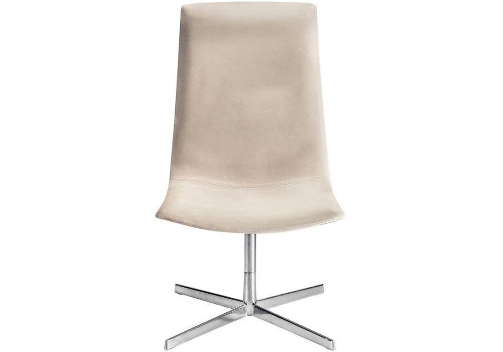 Catifa 60 Office von Lievore Altherr Molina für Arper entworfen ist eine Sitzelement mit vierstrahligem Gestell aus glänzendem Aluminium, drehbar (Art. 2108) oder mit Rückstell- und Schwingmechanismus (Art. 2125). Die Schale mit halbhoher Rückenlehne ist aus Polyurethan, bezogen mit Weichleder, Kunstleder, Stoff.