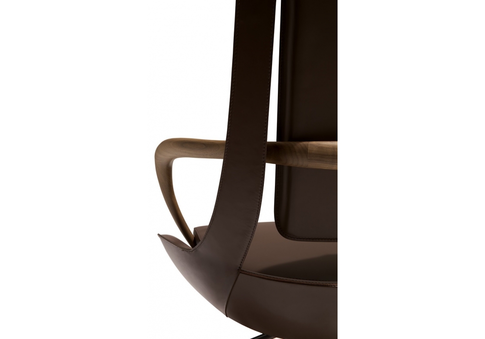 Clip von M2Atelier für Giorgetti entworfen, ist ein Executive Sessel mit Rückenlehne aus profiliertem Stahl, Sitz aus Polimex und Armlehnen aus massivem Canaletto Nussbaum Holz. Die Polsterung besteht aus expandiertem Polyurethan. Drehgestell mit drehbaren Rollen, Gasfeder zur Höhenregulierung und Kippmechanismus. Die Rollen, die Basis und die Struktur sind in Bronze mit natürlicher Wirkung lackiert. Die Polsterung, nicht abnehmbar, ist verfügbar in Kernleder oder Leder.
