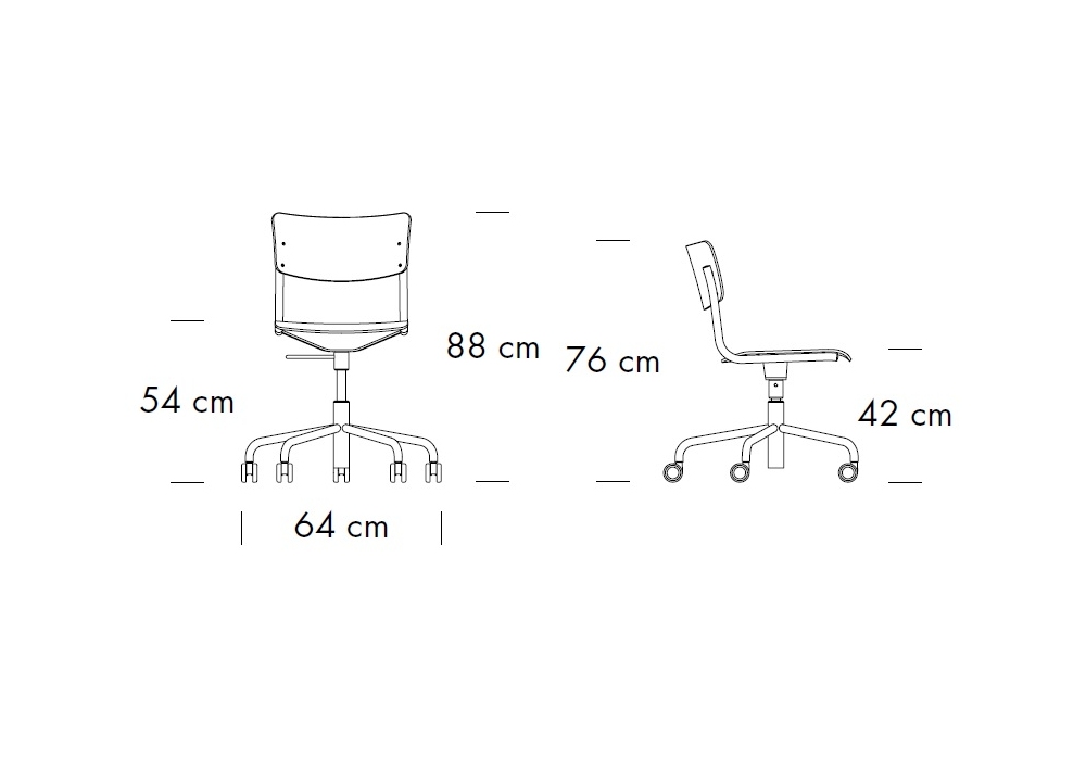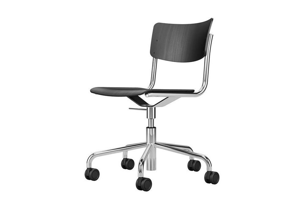 S 43 DR von Mart Stam für Thonet entworfen, ist ein Drehsessel mit verchromtem, weißem oder schwarzem Stahlrohrgestell. Schwarze oder weiße Räder. Sitz und Rückenlehne aus geformtem Buchensperrholz, in verschiedenen Ausführungen erhältlich. Höhenverstellbar.