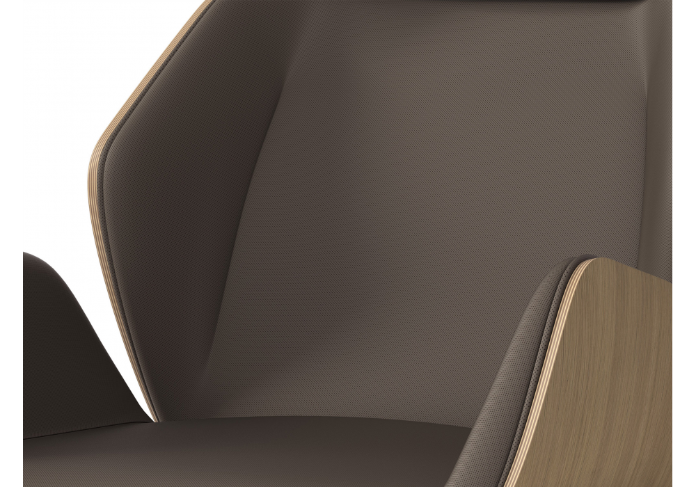 Haiku Wood von R&D Sitlosophy für Sitlosophy entworfen, ist ein Sessel mit Sitzschale aus naturlackiertem Eichenholz und Polsterung aus verschiedenen Ledern, Stoffen oder Öko-Ledern.