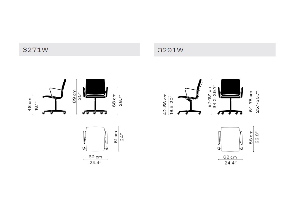 | Armlehnenhöhe | 68 cm (3271W); 64-78 cm (3291W). |
