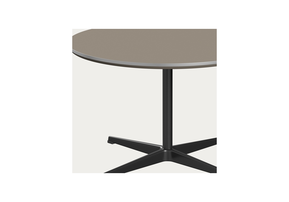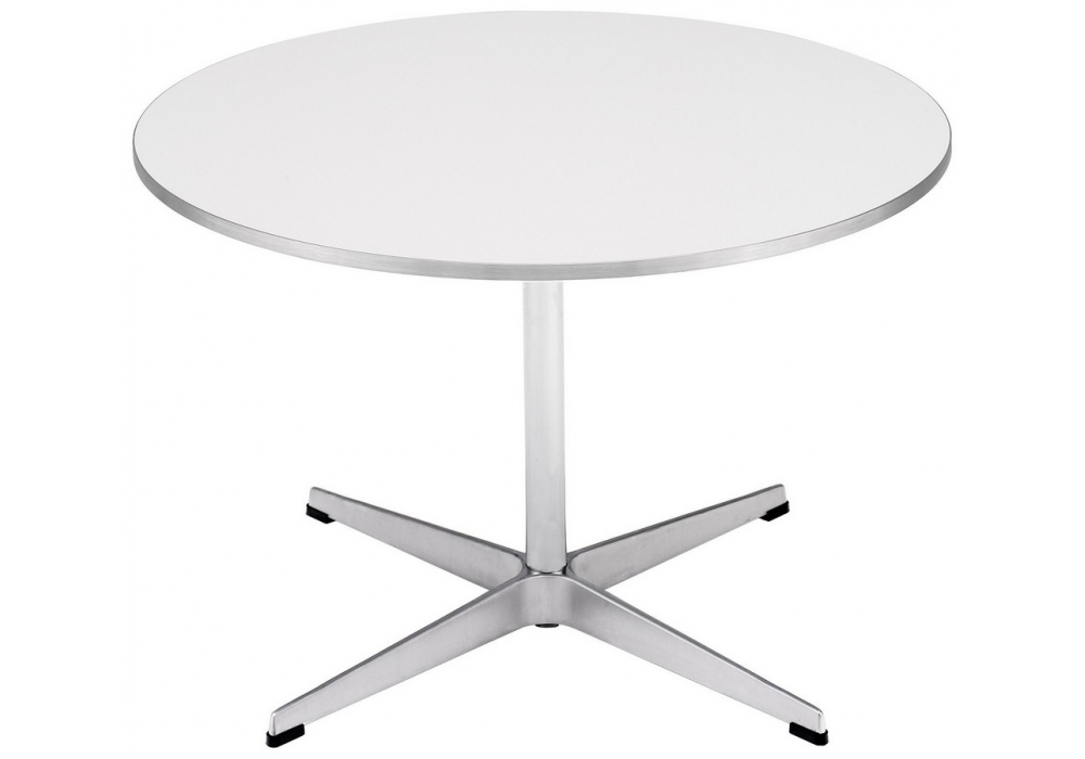 Circular von Arne Jacobsen für Fritz Hansen entworfen, ist ein Couchtisch mit Viersternfuß aus poliertem satiniertem Aluminium oder pulverbeschichtetem Aluminium. Platte aus Laminat oder furniertem Holz. Verfügbar in mehreren Ausführungen und Abmessungen.