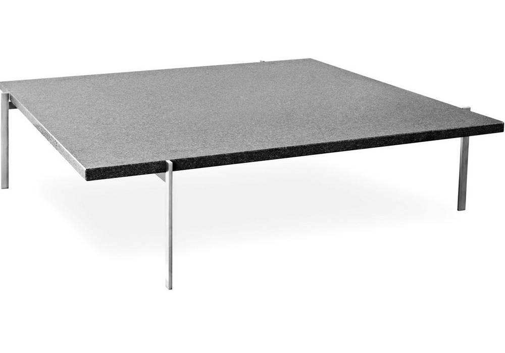 PK61 von Poul Kjærholm für Fritz Hansen entworfen, ist ein Couchtisch mit Basis aus gebürstetem, satiniertem Edelstahl und Platte aus Schiefer, Marmor, Granit, Glas oder Fauske-Marmor.