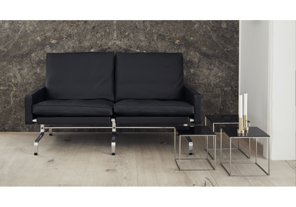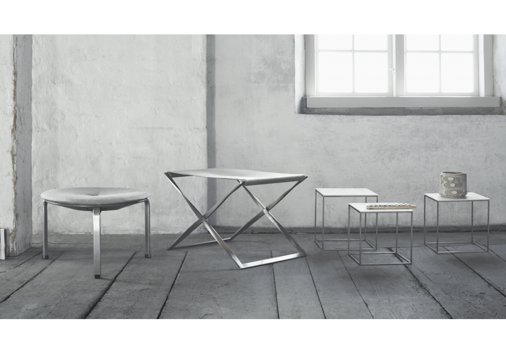 PK71 von Poul Kjærholm für Fritz Hansen entworfen, ist ein Set aus drei Couchtischen mit weißen oder schwarzen Acrylplatten und einer Basis aus gebürstetem, satiniertem Edelstahl.