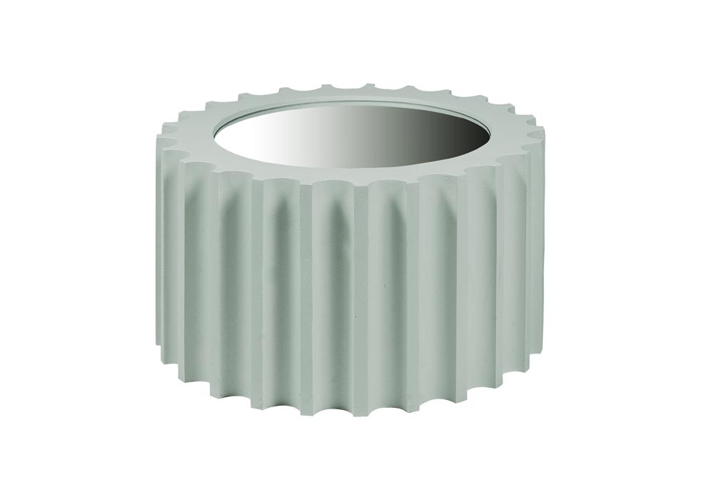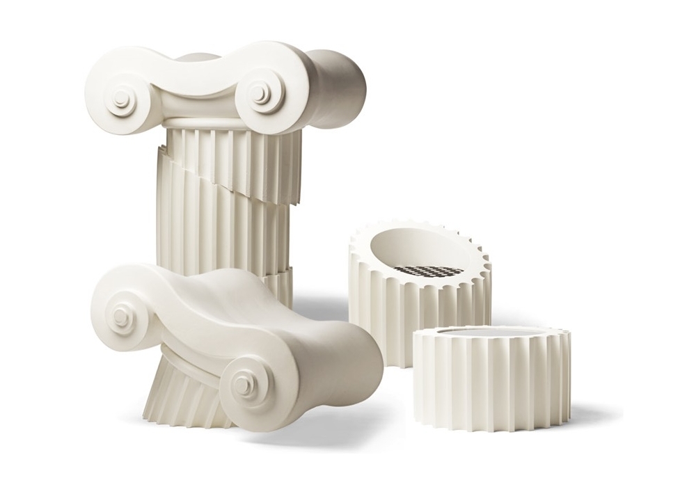 Attica TL, von Studio65 für Gufram entworfen, ist ein Couchtisch, der mit Polyurethanschaum gepolstert und von Hand mit Guflac Ultra veredelt wurde. Stellt den Abschnitt einer griechischen Säule dar, mit einer bifazialen Glasoberfläche, die auf der einen Seite undurchsichtig und auf der anderen spiegelglänzend ist.