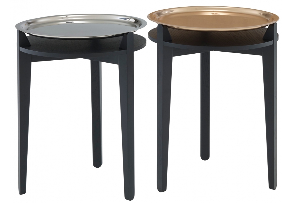 Side Table designed by Jan Christian Delfs for Ligne Roset is an occasional table. This occasional/sofa end table comprises a tripod base in satin-finish black-stained solid ash. It takes a removable round top (H 1.5 Ø 40 cm) in gloss-finish solid copper finished with a rust-proof transparent varnish or in nickel-plated steel.