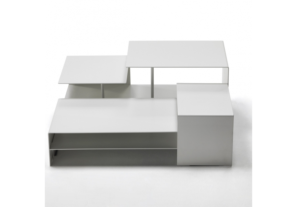 B2 designed by Victor Vasilev for Living Divani reminds an architecture in miniature offering different perspectives from every angle. Table with steel structure consisting of 4 tops of 2,5mm steel sheet screwed to the base, in different heights and dimensions. Indoor: epoxy powder coating in RAL-K7 9010 white or black ANODIK.