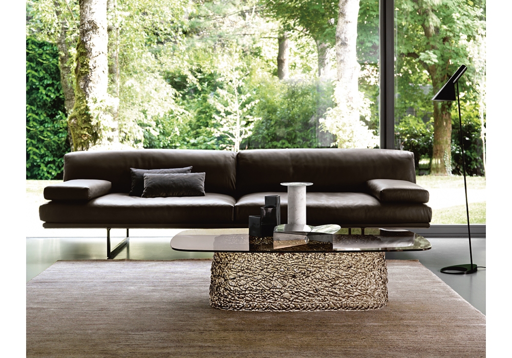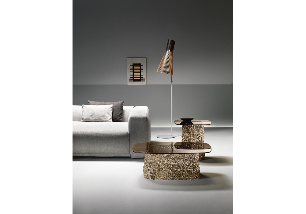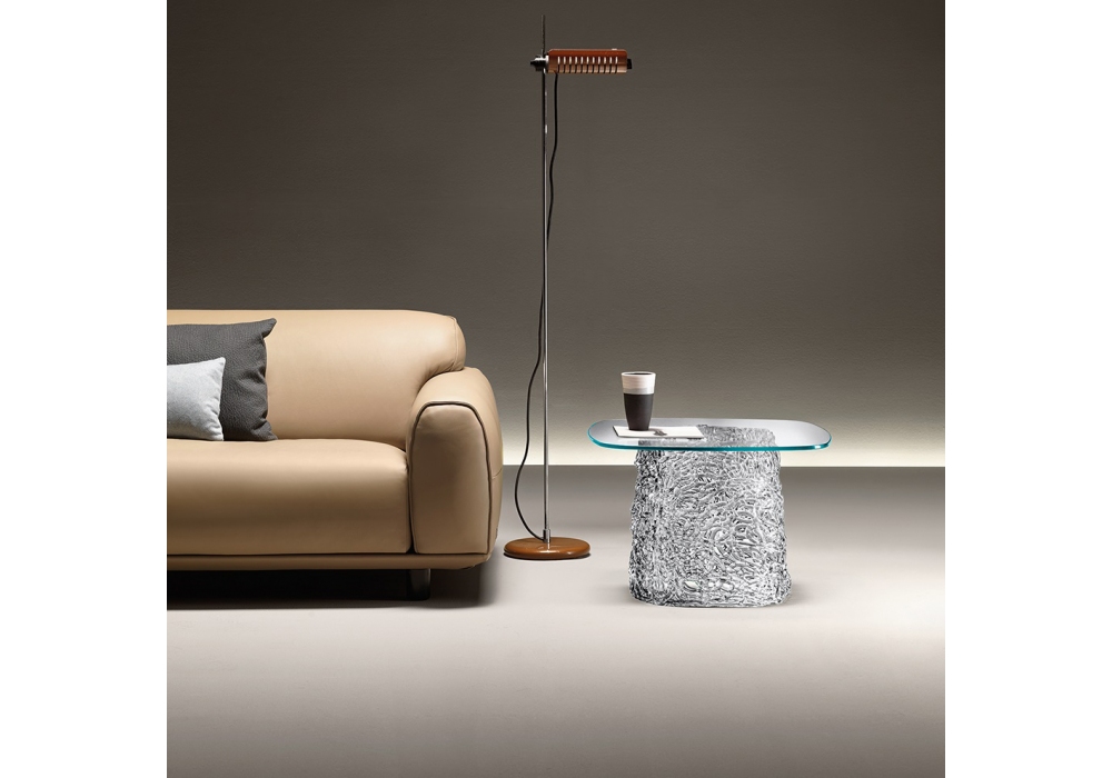 Macramé, entworfen von Lucidi & Pevere für Fiam, ist ein Couchtisch mit einem Gestell aus handgeflochtenem Glas. Tischplatte aus Glas. Erhältlich in folgenden Ausführungen: Rauchgrau, Bronze und Extralight.