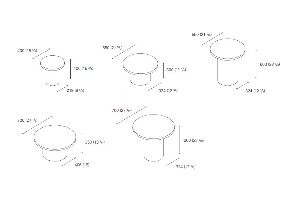 | Abmessungen | Ø 40 x H 40 cm; Ø 55 x H 30 cm; Ø 55 x H 60 cm; Ø 70 x H 35 cm; Ø 70 x H 60 cm. |