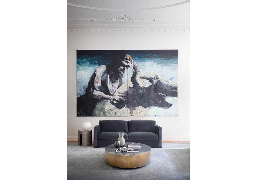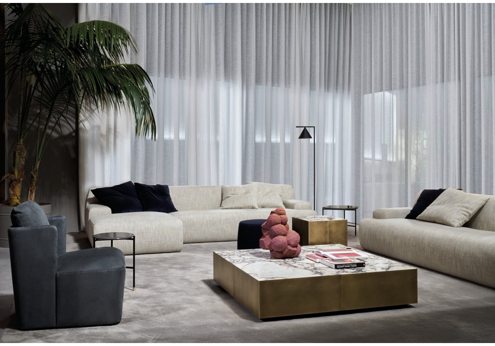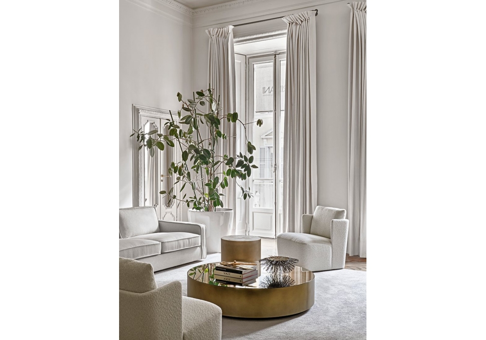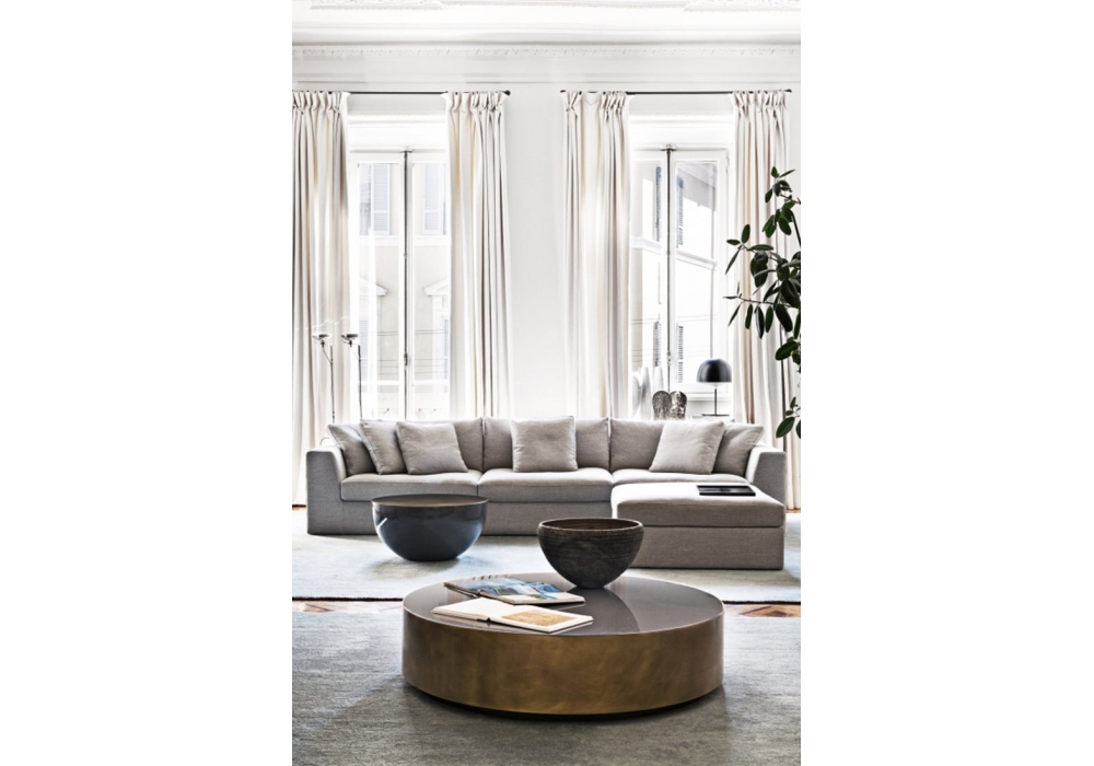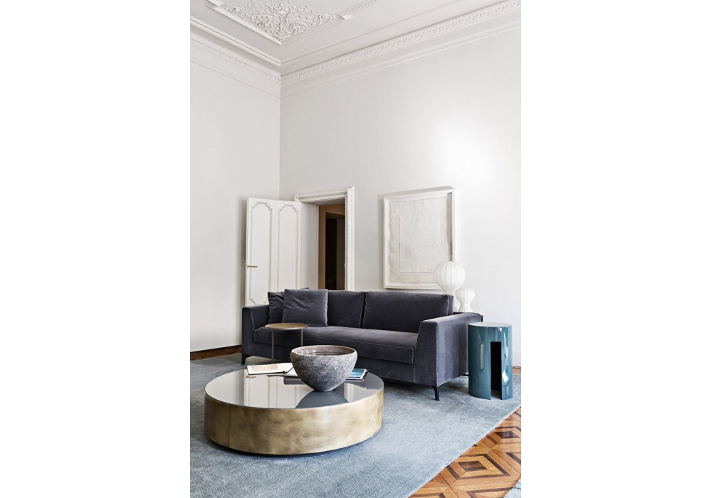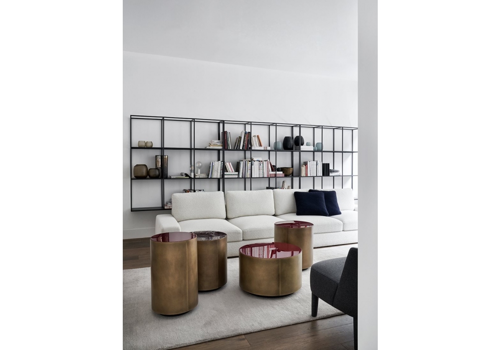 Belt designed by Andrea Parisio for Meridiani is a low table with base in matt lacquer lava finish and wooden frame with bronzed brass or platinum steel side panels. Top available in matt or glossy lacquer, marble, glass, mirror or wood veneer. Belt is made of different sizes and shapes.