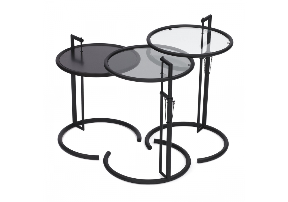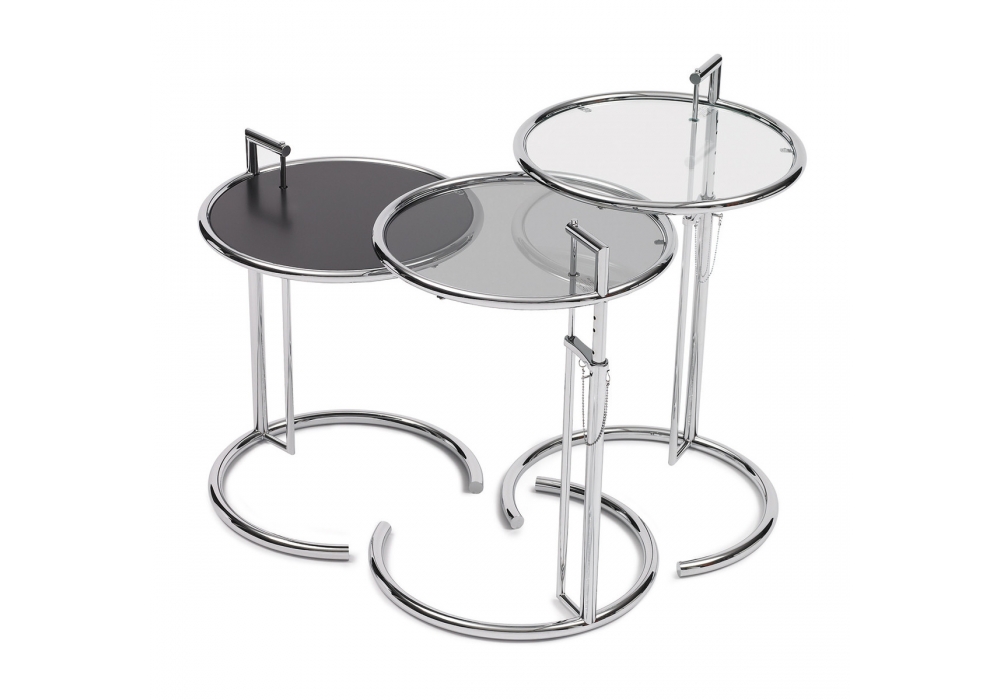 Adjustable Table E 1027 von Eileen Gray für ClassiCon entworfen, ist ein schöner Beistelltisch mit Gestell höhenverstellbar aus pulverbeschichtetem Stahlrohr in Schwarz oder verchromt. Tischplatte Kristallglas klar, Parsolglas grau oder Metallplatte schwarz lackiert.
