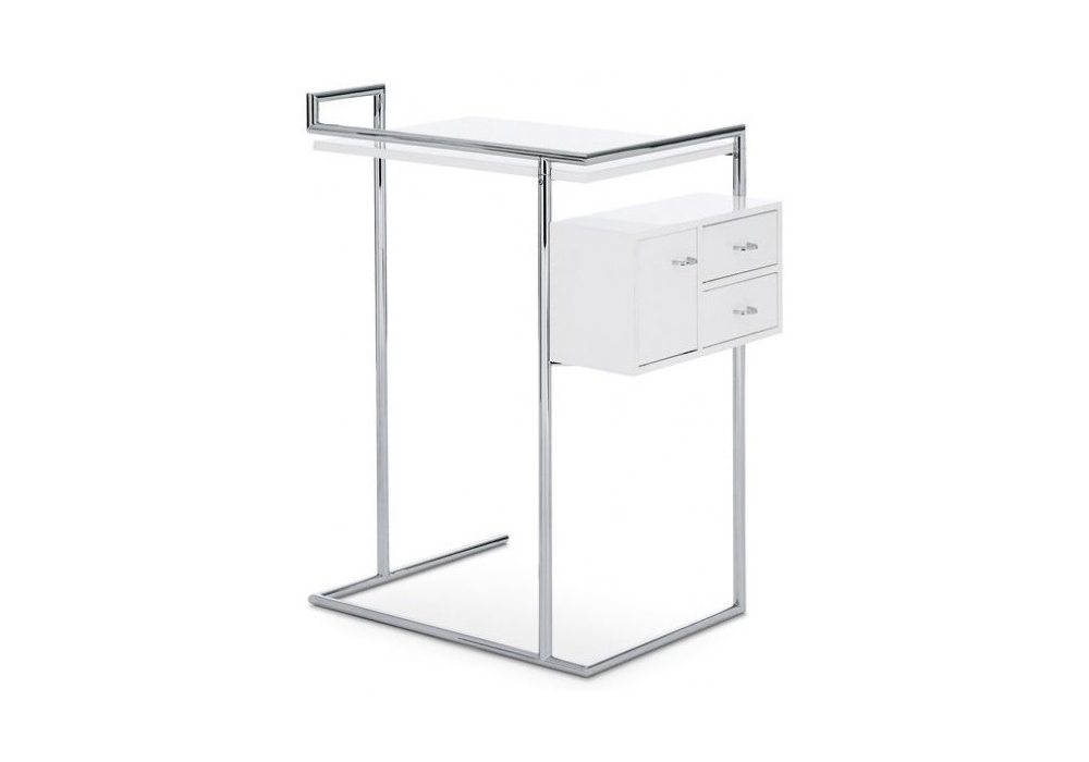 Petite Coiffeuse von Eileen Gray für ClassiCon entworfen, ist ein Schminkstisch bestehend aus Tischplatte und eingehängter Box mit zwei schwenkbaren Laden und einer Tür. Gestell aus verchromtem Stahlrohr. Tischplatte und Box in MDF hochglanzlackiert.