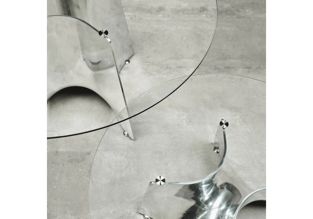 Bentz von Jeff Miller für Baleri Italia entworfen, ist ein schöner Couchtisch mit Gestell aus Aluminiumguss und 10 mm starken temperierten Kristallglasplatten, rund, quadratisch oder rechteckig, die durch einen innovativen Mechanismus am Gestell befestigt werden.