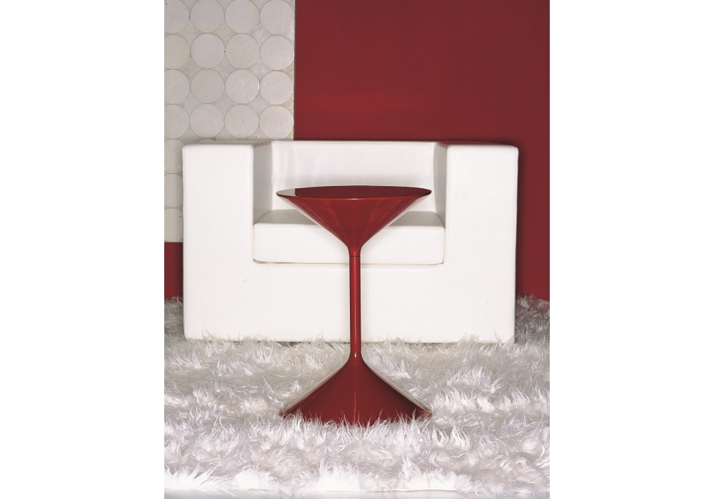 631 Tempo von Prospero Rasulo für Zanotta entworfen, ist eine Beistelltisch mit Gestell aus steifem Polyurethan und Trägerstange aus Stahl. Lackierung in den Farben weiß, schwarz oder rot.