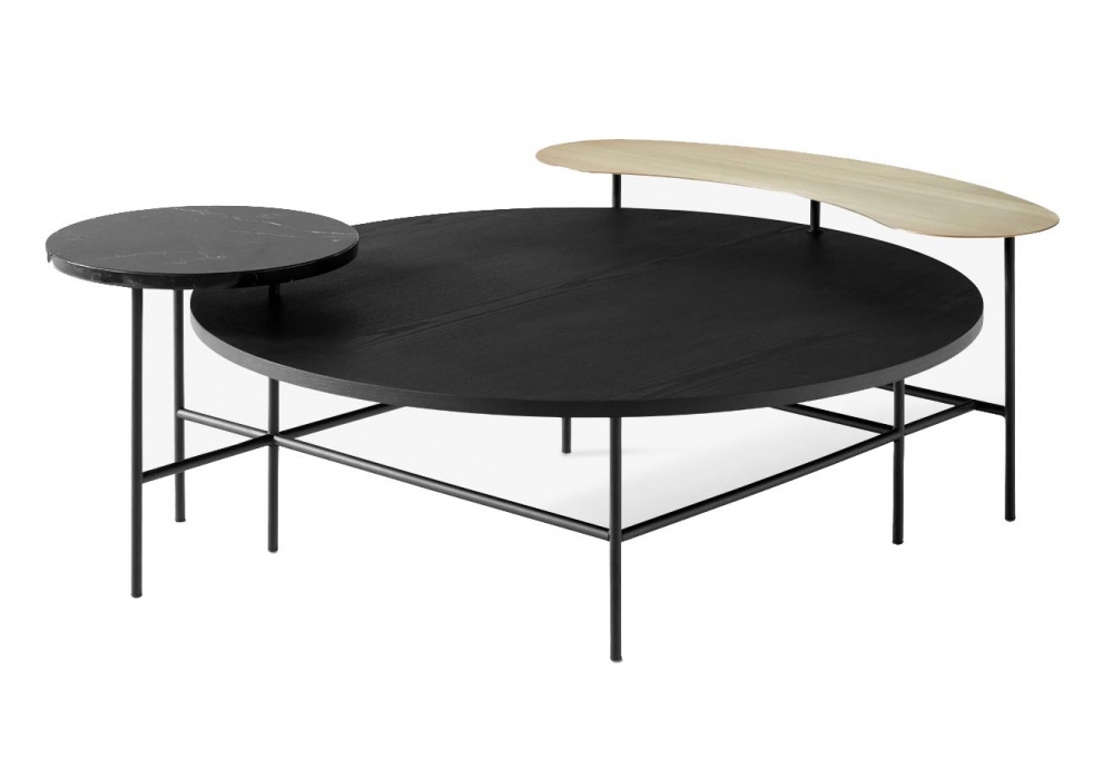 Palette von Jamie Hayon für &Tradition entworfen, ist ein Beistelltisch mit einem Untergestell aus geschweißten und pulverbeschichteten Stahlrohren. Die Tischplatten bestehen aus lasergeschnittenem, poliertem, satiniertem Messing, poliertem Marmor und lackiertem Furnier. Verfügbar in mehreren Abmessungen.