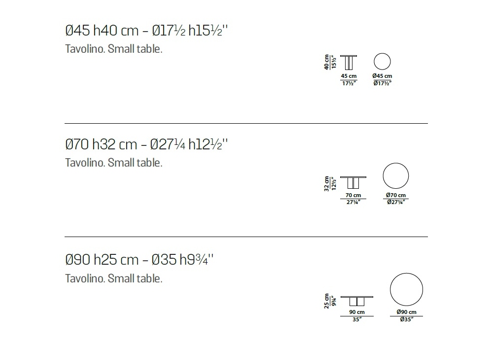 | Abmessungen | Ø 45 x H 40 cm; Ø 70 x H 32 cm; Ø 90 x H 25 cm. |