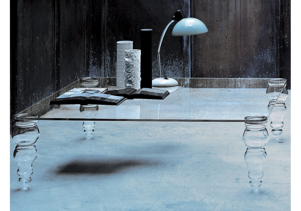 Glas Italia, Post modern: Satz hoher und niedriger Tische mit viereckiger,rechteckiger und runder Form. Die Platte ist intransparentem Glas, transparentem Extralight Glas, geätztem Extralight Glas, lackiertem Glas erhältlich. Die Füsse sind in gedrechseltem und profiliertem Borosilikatglas.