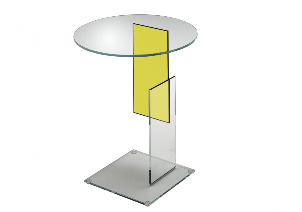 Don Gerrit, von Jean Marie Massaud für Glas Italia entworfen, ist ein Couchtisch mit Untergestell, das durch Zusammenkleben von zwei Platten aus gehärtetem Glas hergestellt wird. Sie ist in der Ausführung komplett aus Rauchglas und in transparentem Extralight-Glas mit blauem, gelbem oder rotem transparentem Glaseinsatz erhältlich. Ober- und Unterteil sind mit einer polierten Stahlplatte zusammengebaut.