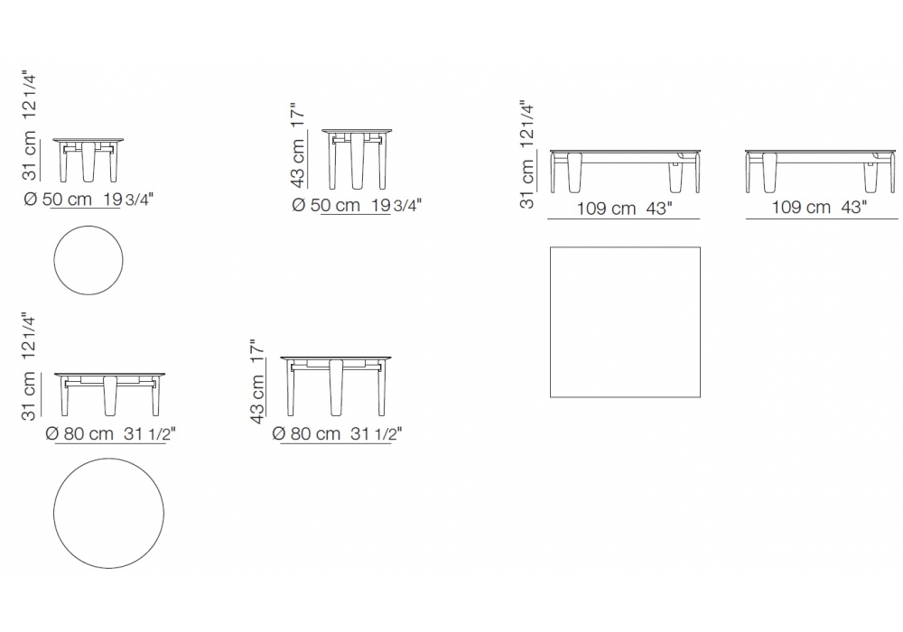 | Abmessungen | Ø 50 x H 31 cm; Ø 50 x H 43 cm; Ø 80 x H 31 cm; Ø 80 x H 43 cm; 109 x 109 x H 31 cm. |
