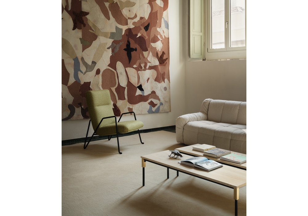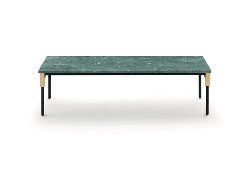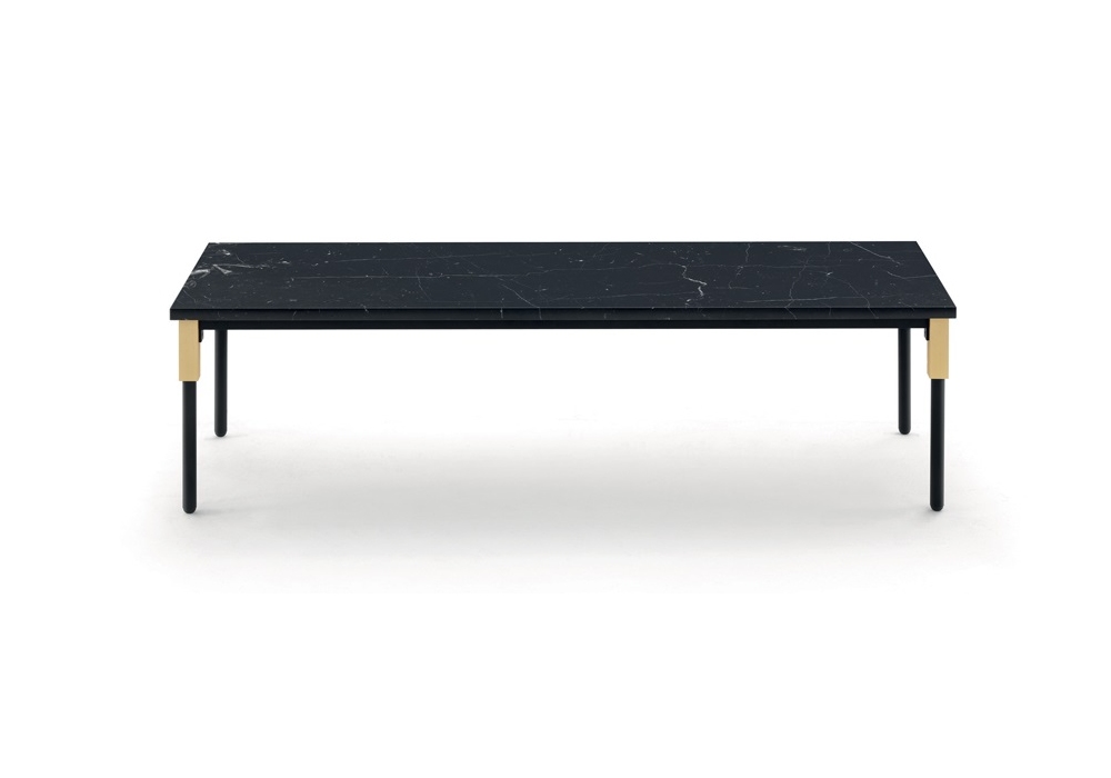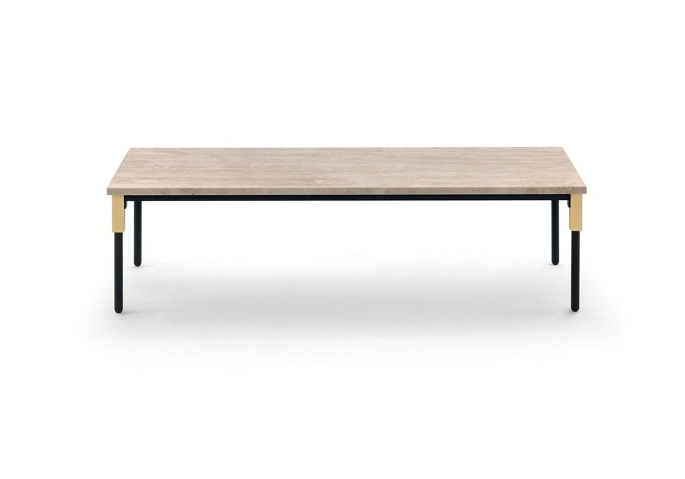 Match von Bernhardt & Vella für Arflex entworfen, ist eine Sammlung von Couchtischen mit einem mattschwarz lackierten Metallrahmen und Messingverbindungen. Marmor- oder Travertinplatte. Verfügbar in mehreren Abmessungen.