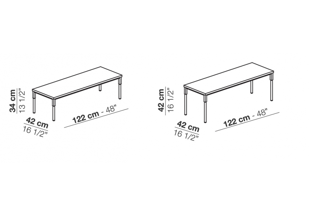 | Abmessungen | 122 x 42 x H 34 cm; 122 x 42 x H 42 cm. |