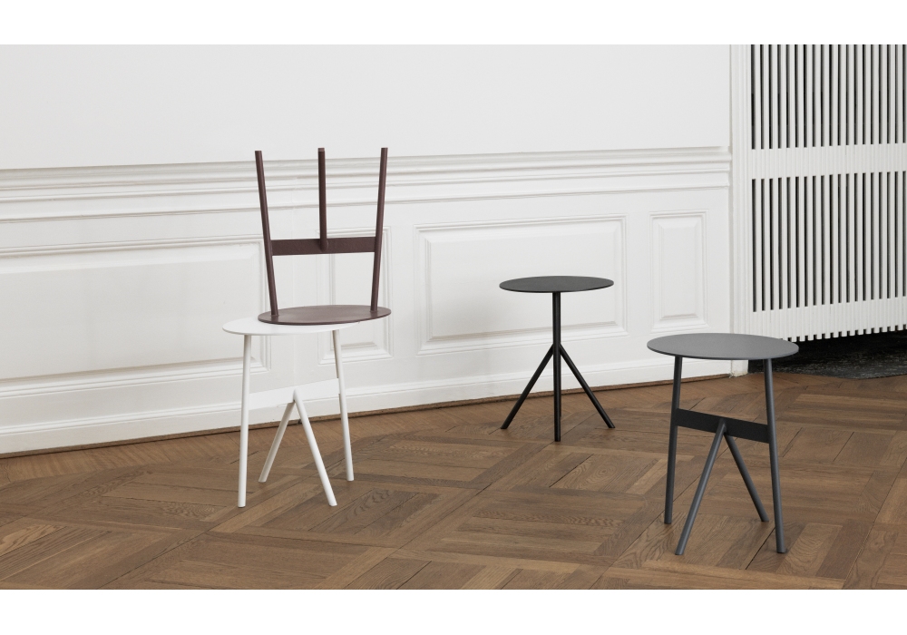 Stock, entworfen von Msds Studio für Normann Copenhagen, ist ein Couchtisch mit röhrenförmiger Struktur und runder Platte, die vollständig aus Stahl besteht. Der Schaft ist pulverbeschichtet und in vier verschiedenen Ausführungen erhältlich; weiß, wein, blau und schwarz.