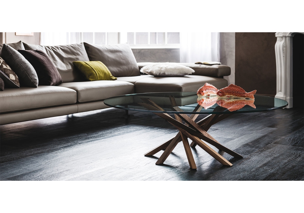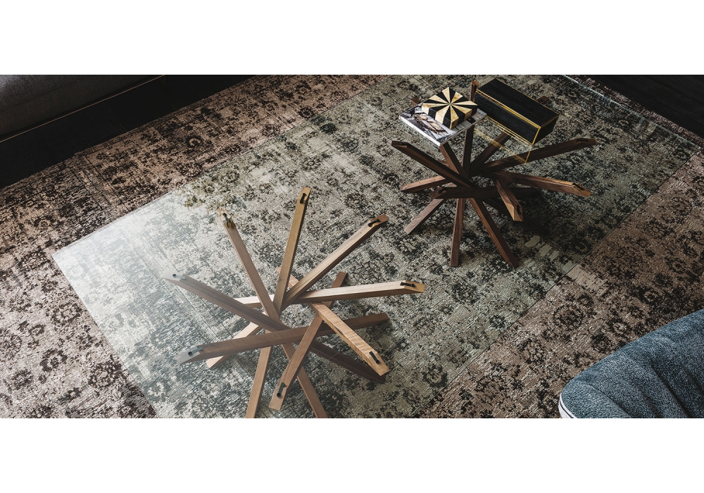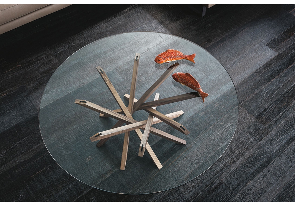 Atari, von Giorgio Cattelan für Cattelan Italia entworfen, ist einer Couchtisch mit Basis aus massivem Nussbaum Canaletto oder Nussbaum gebeizt "verbrannte Eiche". Platte in Klarglas. Verfügbar in verschiedenen Formen und Abmessungen.
