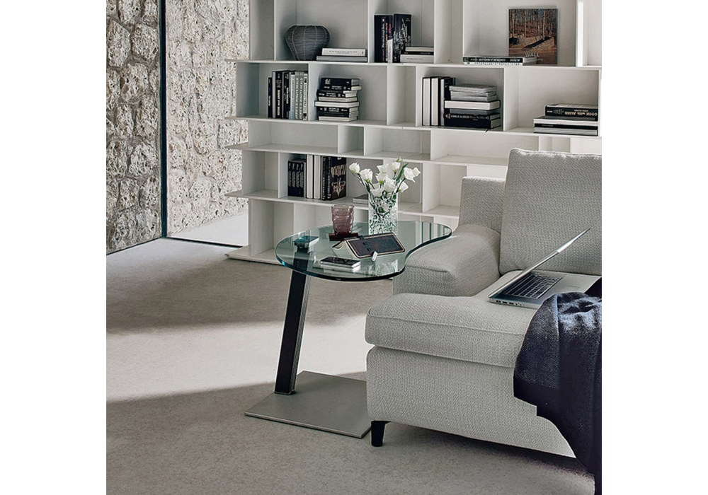 Lap, von Giorgio Cattelan für Cattelan Italia entworfen, ist einer Beistelltisch mit Platte aus rechtwinkeligem oder nierenförmigem Klarglas 12mm. Gestell aus Edelstahl mit verchromtem Bein oder mit Leder bezogen, verfügbar in verschiedenen Ausführungen. Mit höhenverstellbarem Gestell. Verfügbar in zwei Abmessungen.