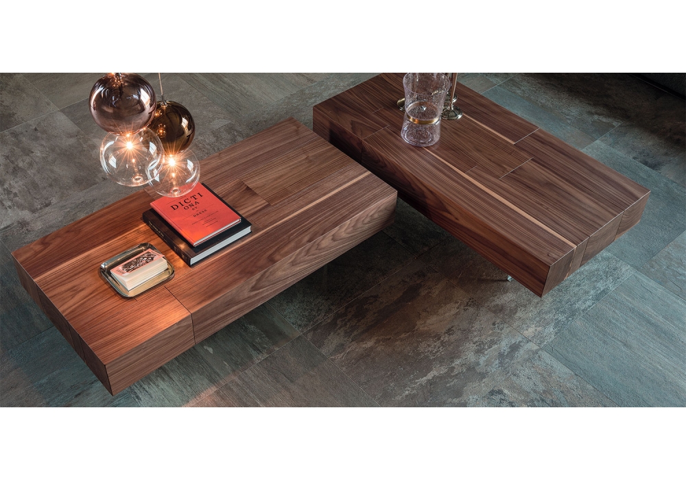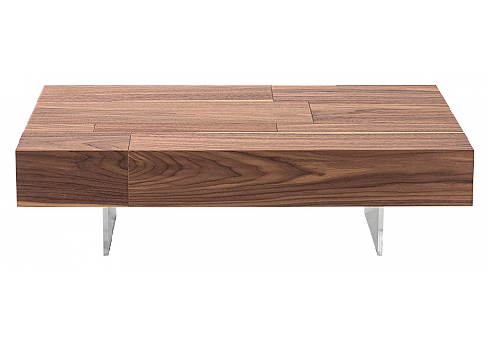 Lingotto, von Paolo Cattelan für Cattelan Italia entworfen, ist einer Couchtisch mit Platte aus Canaletto Nussbaumholz und Füßen aus transparentem Methacrylat. Verfügbar in zwei Abmessungen.