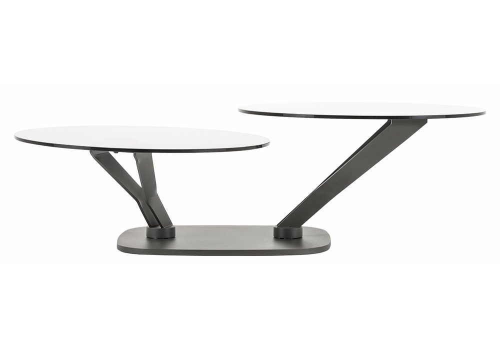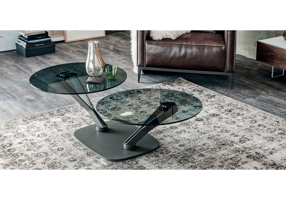 Viper, von Emanuele Zenere für Cattelan Italia entworfen, ist einer Couchtisch mit Basis aus Stahl lackiert graphitegaufriert. Verfügbar in verschiedenen Größen, mit ein oder zwei drehbaren Platte in Klar- oder rauchigem Glas.