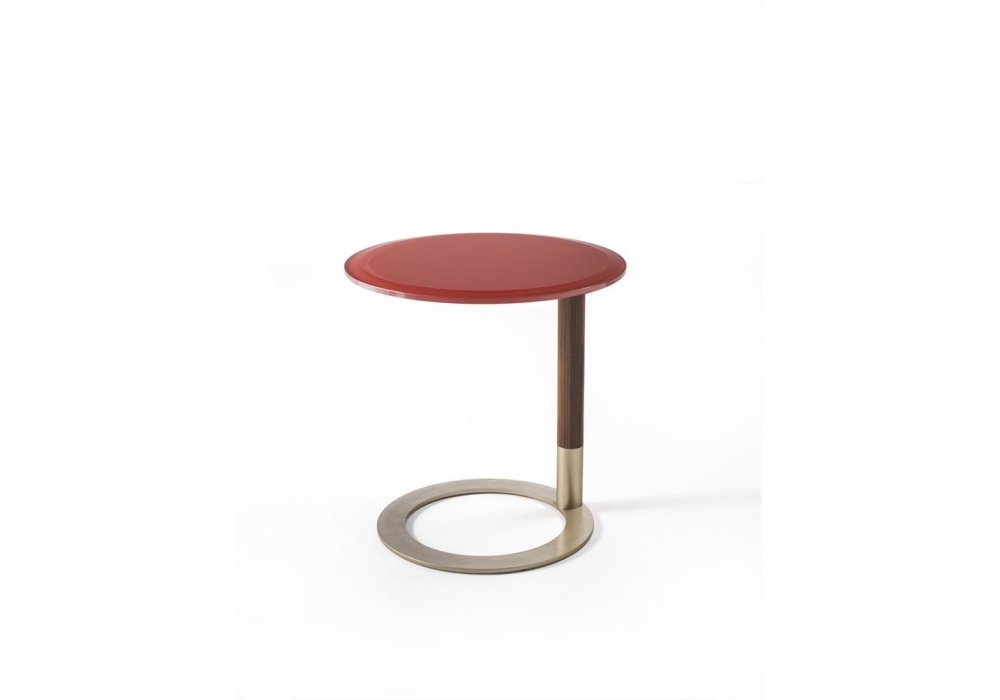 Jok, von Gabriele & Oscar Buratti für Porada entworfen, ist einer Beistelltisch mit Metallsockel, Holzstiel und Glas- oder Steinplatte.