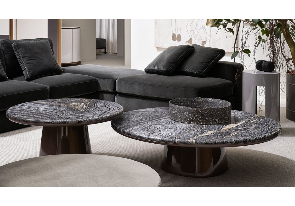 Leon von Andrea Parisio für Meridiani ist ein Couchtisch komplett in Holz mit matt oder glänzend lackiert oder in der Version mit Marmorplatte.