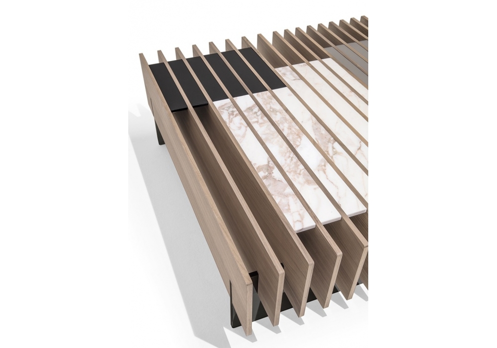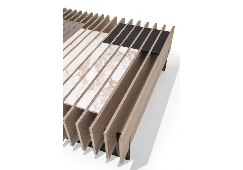 Fit von Giancarlo Bosio & Centro Ricerche für Giorgetti entworfen, ist ein Couchtisch mit Lattenrost aus massivem Canaletto Nussbaum Holz und Basis aus grauem gehärtetem Kristallglas. Die drei oberen Einsätze sind verfügbar aus Marmor oder aus Metall lackiert.