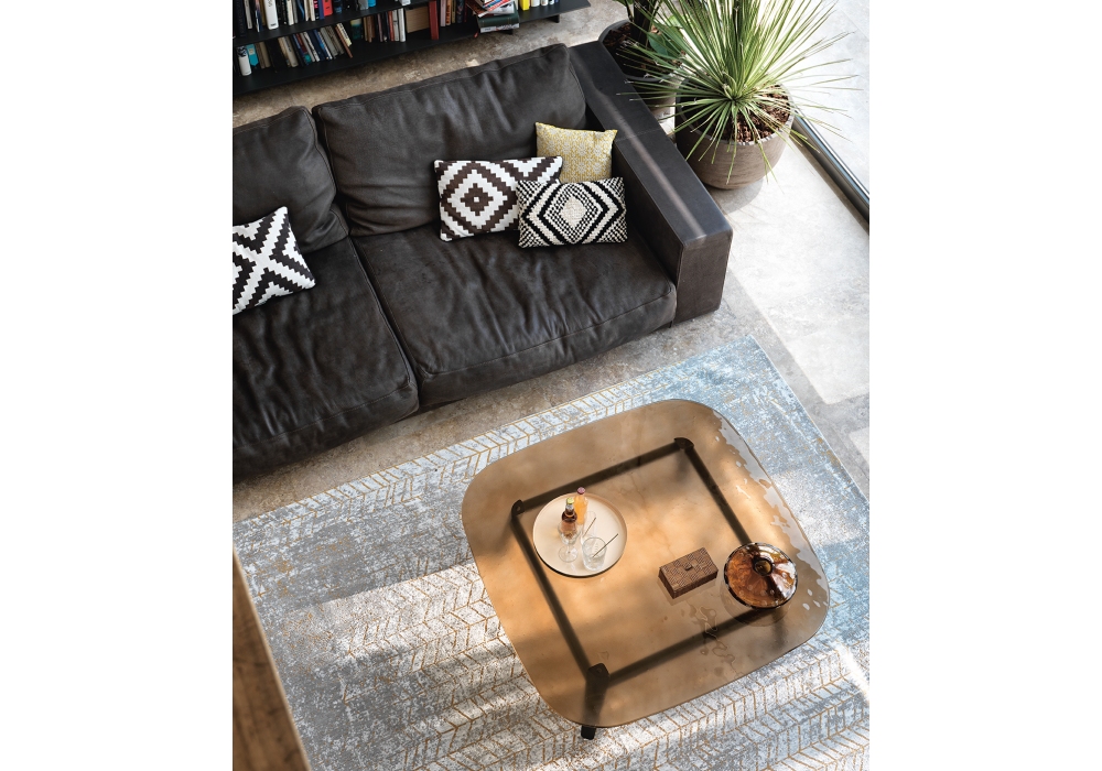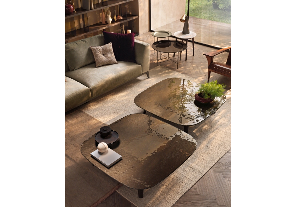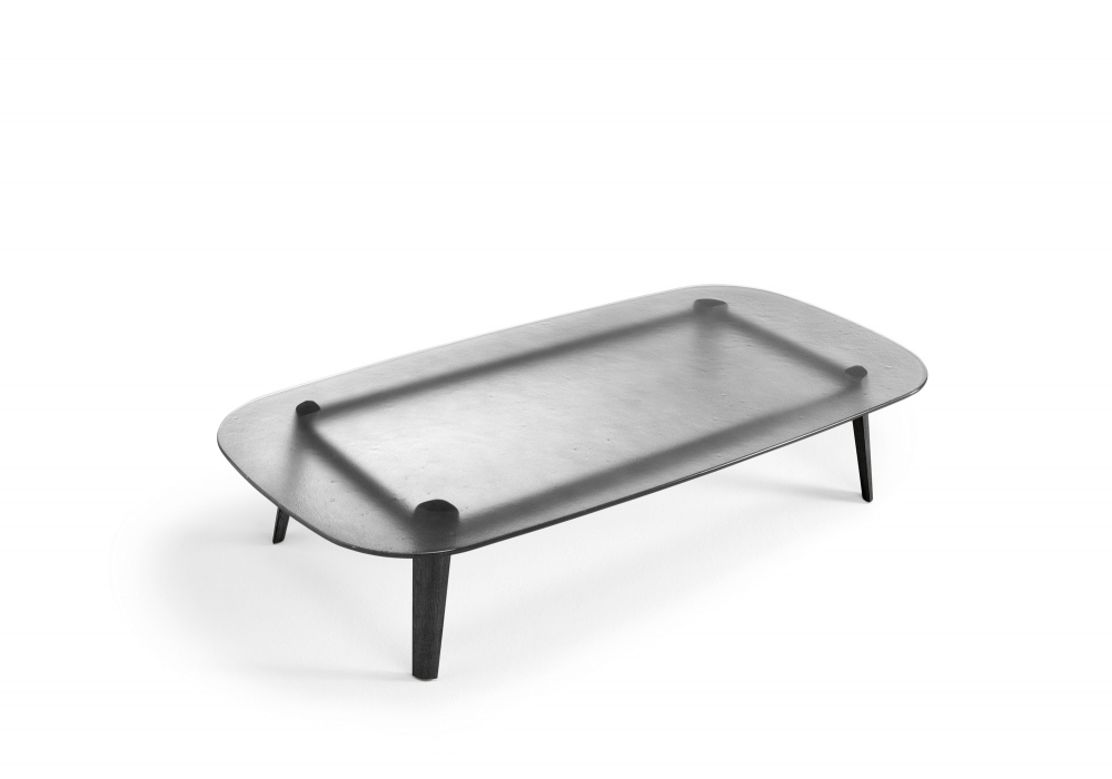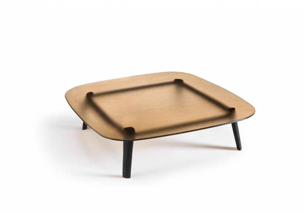 Magma von Patrick Jouin für Fiam entworfen, ist ein Couchtisch mit einer Platte aus geschmolzenem Glas, gehärtet und mit halbtransparenter, metallischer oder marmorierter Rückseite lackiert. Basis aus Massivholz in Tabak oder wärmebehandeltem Schwarz.