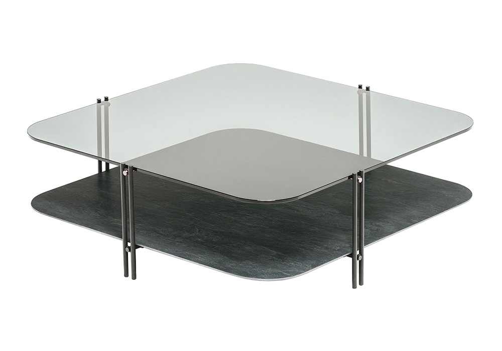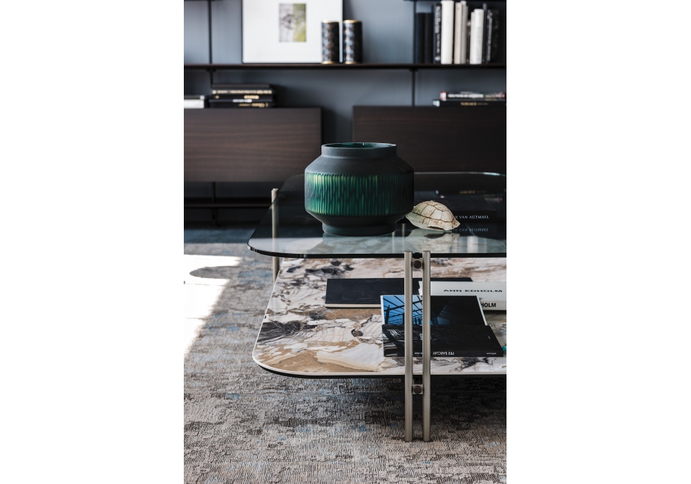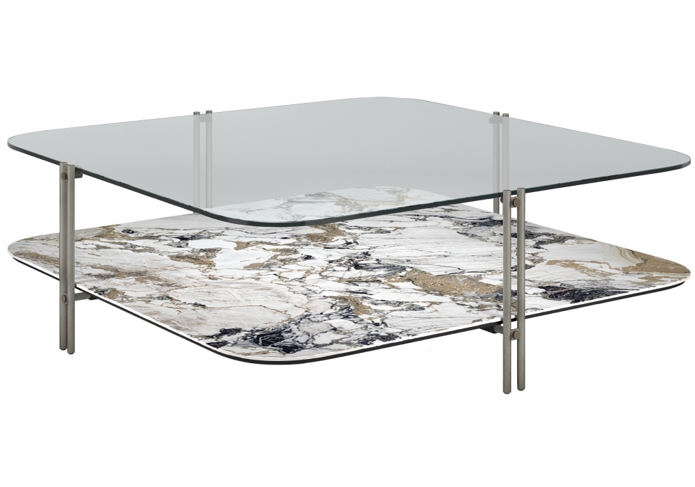 Biplane, von Paolo Cattelan für Cattelan Italia entworfen, ist einer Couchtisch mit Stahlstruktur, obere Platte aus Glas, untere Platte aus Keramik. Mit bronzenen Details. Verfügbar in zwei verschiedenen Abmessungen.