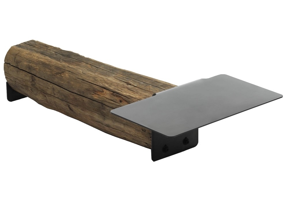 Beam Low von Damien Gernay für Mogg entworfen, ist ein Couchtisch/Bank bestehend aus einem antiken Holzbalken, komplett mit einer glänzenden, bleilackierten Metallplatte.