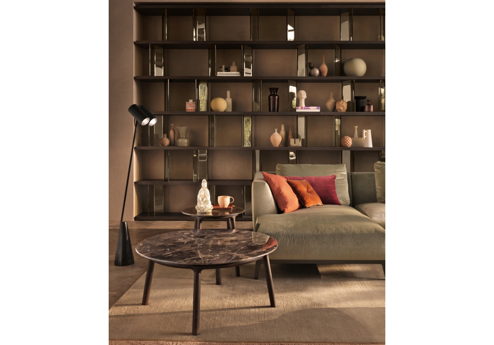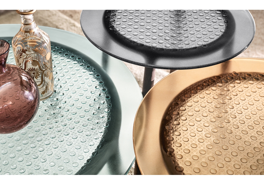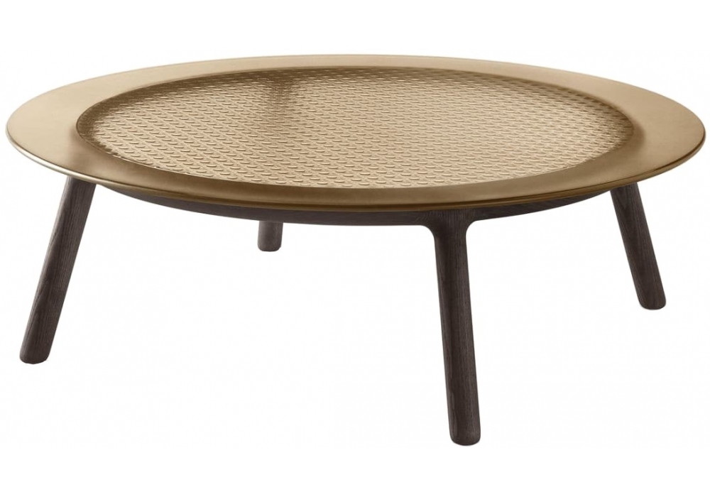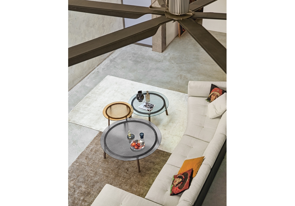 Cannage von Emmanuel Gallina für Fiam entworfen, ist ein Couchtisch mit Struktur aus offenporiger massiver Eiche in Tabakfarbe. Platte aus gehärtetem und geschmolzenem Glas mit „Cannage“-Textur, erhältlich transparent oder rückseitig lackiert mit halbtransparenten Oberflächen oder mit Metallic-Farben. Tischplatte auch in Marmor erhältlich.