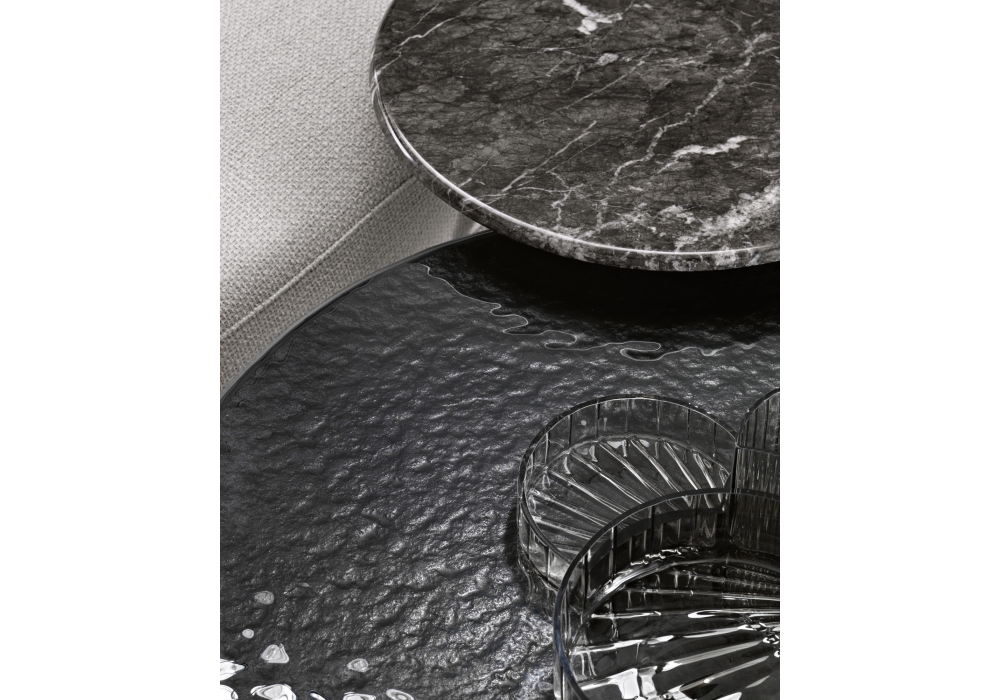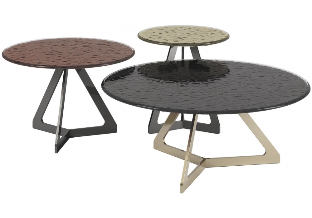 Lakes von Studio Klass für Fiam entworfen, ist ein Couchtisch mit einer Platte aus geschmolzenem Glas mit rückseitiger Lackierung in Metallic-Farben oder aus Marmor und einem Sockel aus lackiertem Metall.