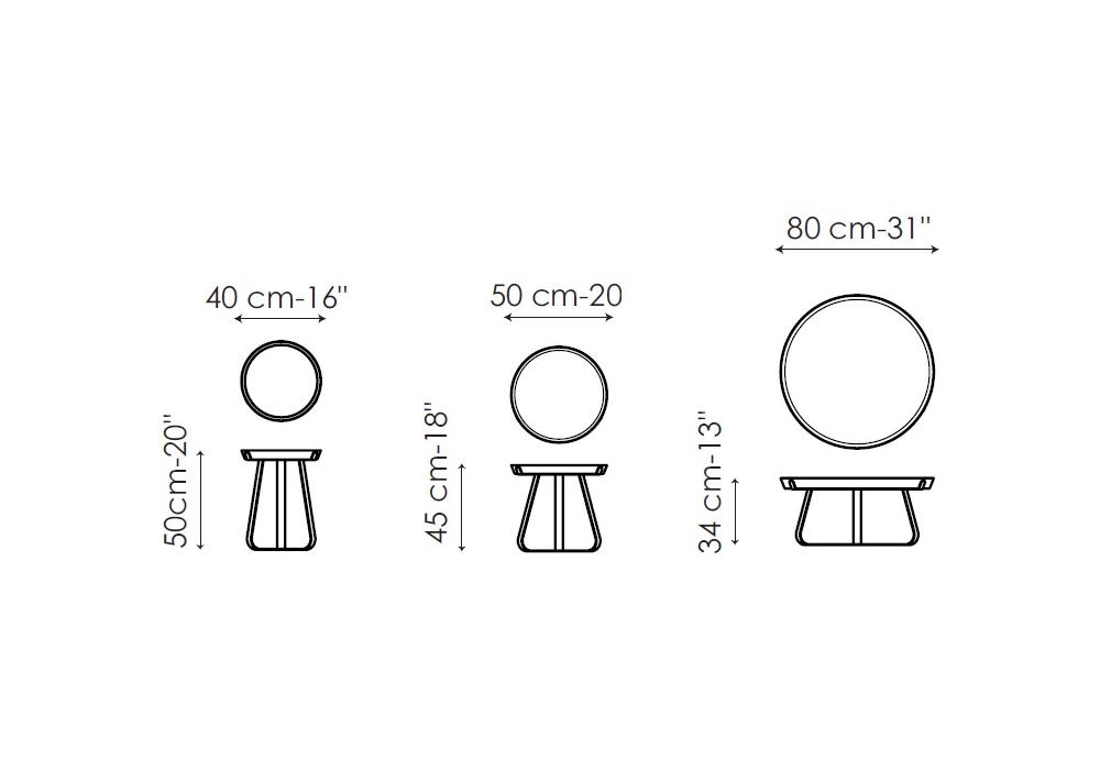 | Abmessungen | Ø 40 x H 50 cm; Ø 50 x H 45 cm; Ø 80 x H 34 cm. |