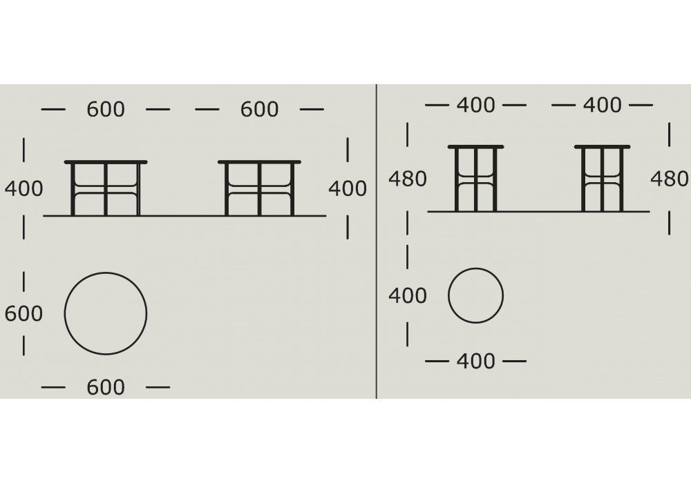 | Abmessungen | ⌀ 60 x H 40 cm; ⌀ 40 x H 48 cm. |