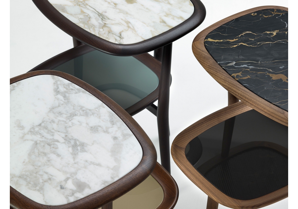 Petit Matin von Roberto Lazzeroni für Ceccotti Collezioni entworfen, ist ein Couchtisch aus Holz, obere Oberseite aus Glas oder Marmor und untere Oberseite aus Glas. Verfügbar in mehreren Ausführungen.