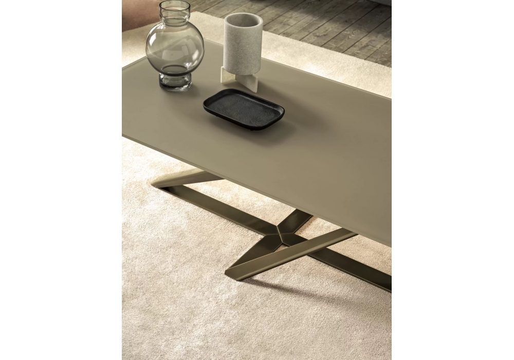 Millennium von Pocci & Dondoli für Bontempi entworfen, ist ein rechteckiger Couchtisch mit Stahlstruktur und Platte aus Glas, Holz oder Marmor, verfügbar in verschiedenen Ausführungen und Größen.