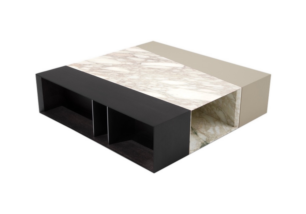 Scaleno von Giancarlo Bosio & Centro Ricerche für Giorgetti entworfen, ist ein Couchtisch mit Einsätzen aus Marmor, Leder und Eschenholz. Verfügbar in verschiedenen Ausführungen.