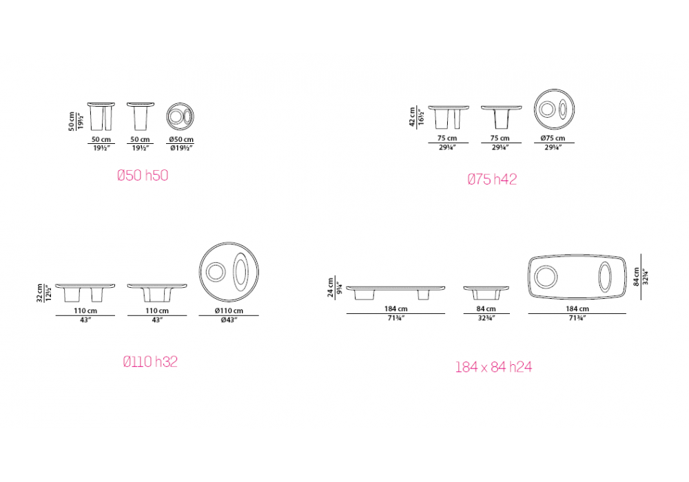 | Abmessungen | Ø 50 x H 50 cm; Ø 75 x H 42 cm; Ø 110 x H 32 cm; 184 x 84 x H 24 cm. |
