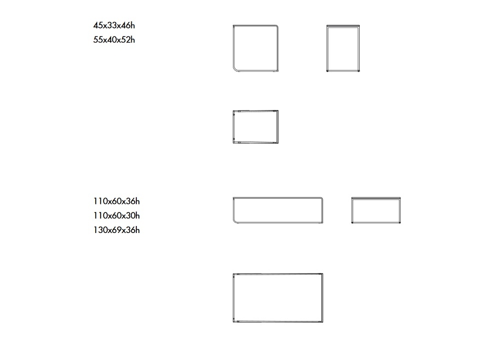 | Abmessungen | 45 x 33 x H 46 cm; 55 x 40 x H 52 cm; 110 x 60 x H 36 cm; 110 x 60 x H 30 cm; 130 x 69 x H 36 cm; |