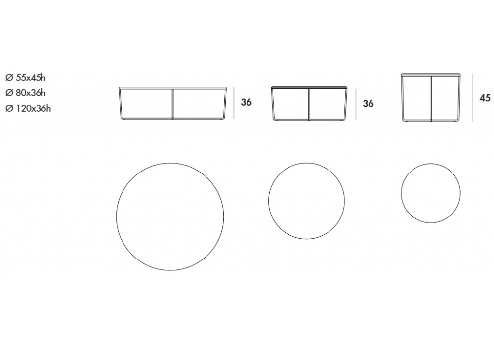 | Abmessungen | Ø 55 x H 45 cm; Ø 80 x H 36 cm; Ø 120 x H 36 cm |