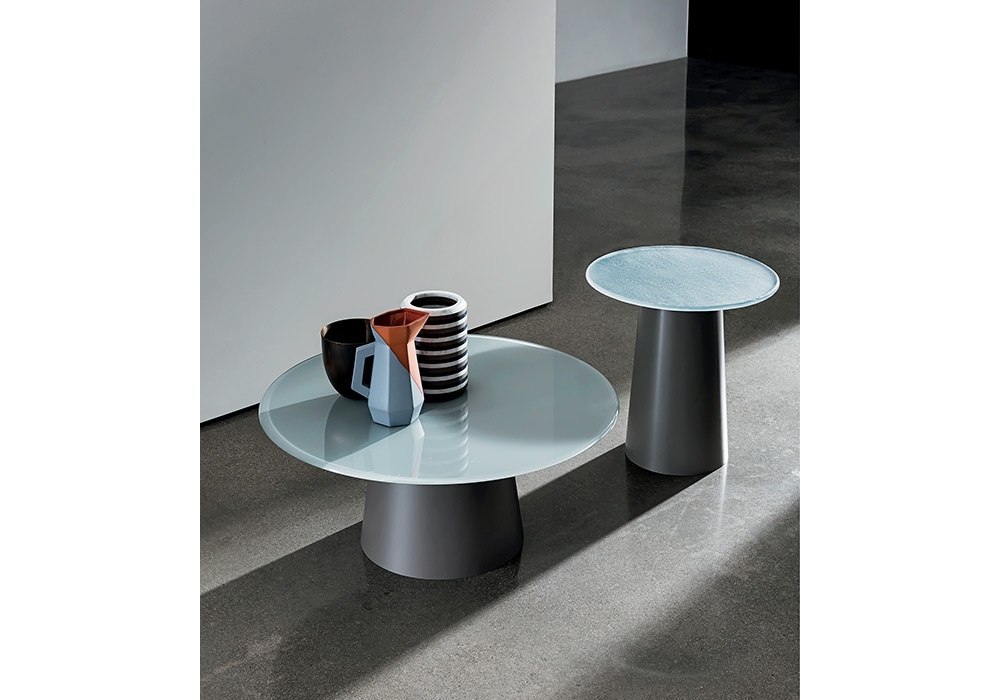Totem von Lievore, Altherr, Molina für Sovet entworfen, ist ein Couchtisch aus Metall und einer Platte aus Glas, Keramik oder Holz. Verfügbar in mehreren Ausführungen und Abmessungen.