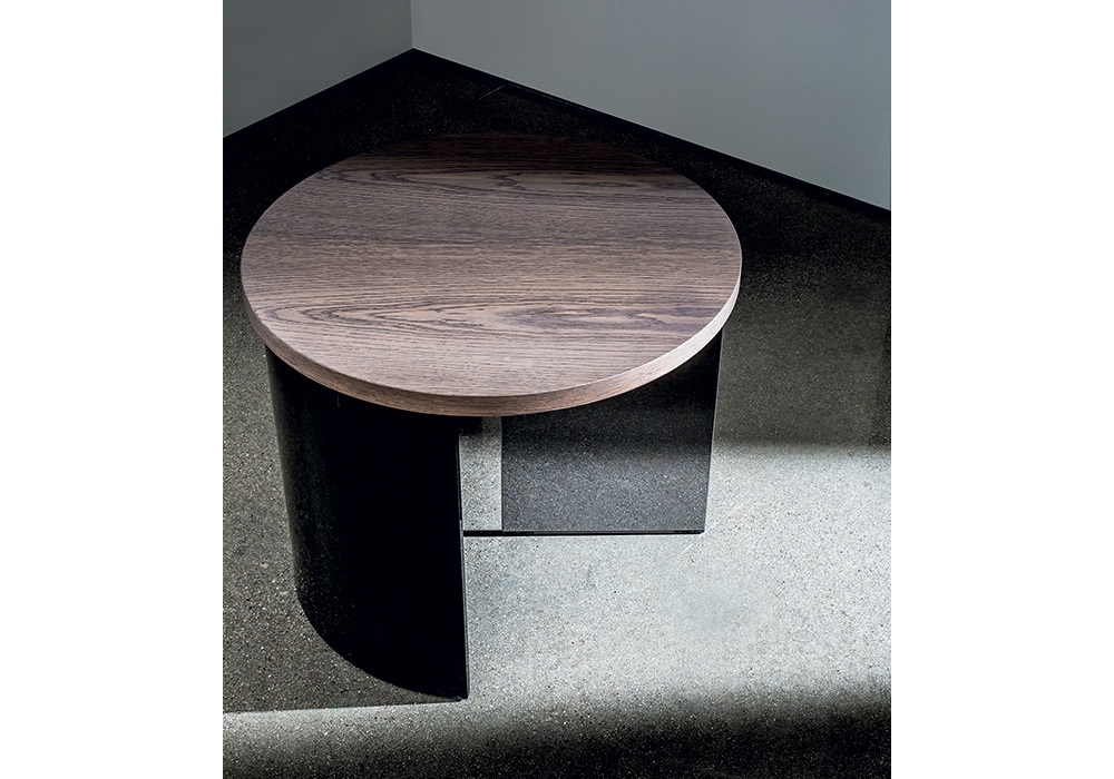 Regolo Runder von Lievore, Altherr, Molina für Sovet entworfen, ist ein Couchtisch aus Eichenholz, der aus einem Rauchglaselement und einem schwarz lackierten, gebogenen Glaselement besteht. Verfügbar in mehreren Ausführungen und Abmessungen.